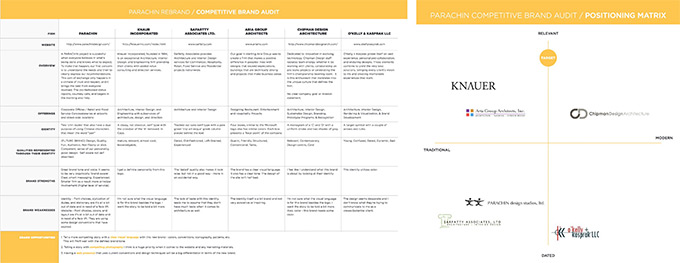 左側為競爭對手評估,右側為定位模型。兩者均為分析 Parachin Design Studios 的市場評估。