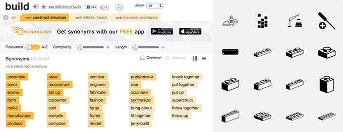 我通常先從同義詞為發散點,我會使用直觀的同義詞詞典 thesaurus.com 或是視覺同義詞庫 The Noun Project。剖析項目簡報中的關鍵詞,找到其更豐富的含義,可能是一小段演說詞,也可能是流行語句或成語。