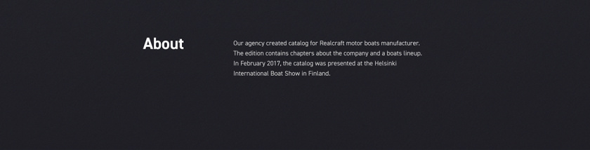 realcraft摩托艇制造商的宣傳畫冊設(shè)計與產(chǎn)品型錄設(shè)計,。這個版本包含了關(guān)于公司的章節(jié)和一個船的陣容。2017年2月,該目錄在芬蘭赫爾辛基國際船展上發(fā)布。