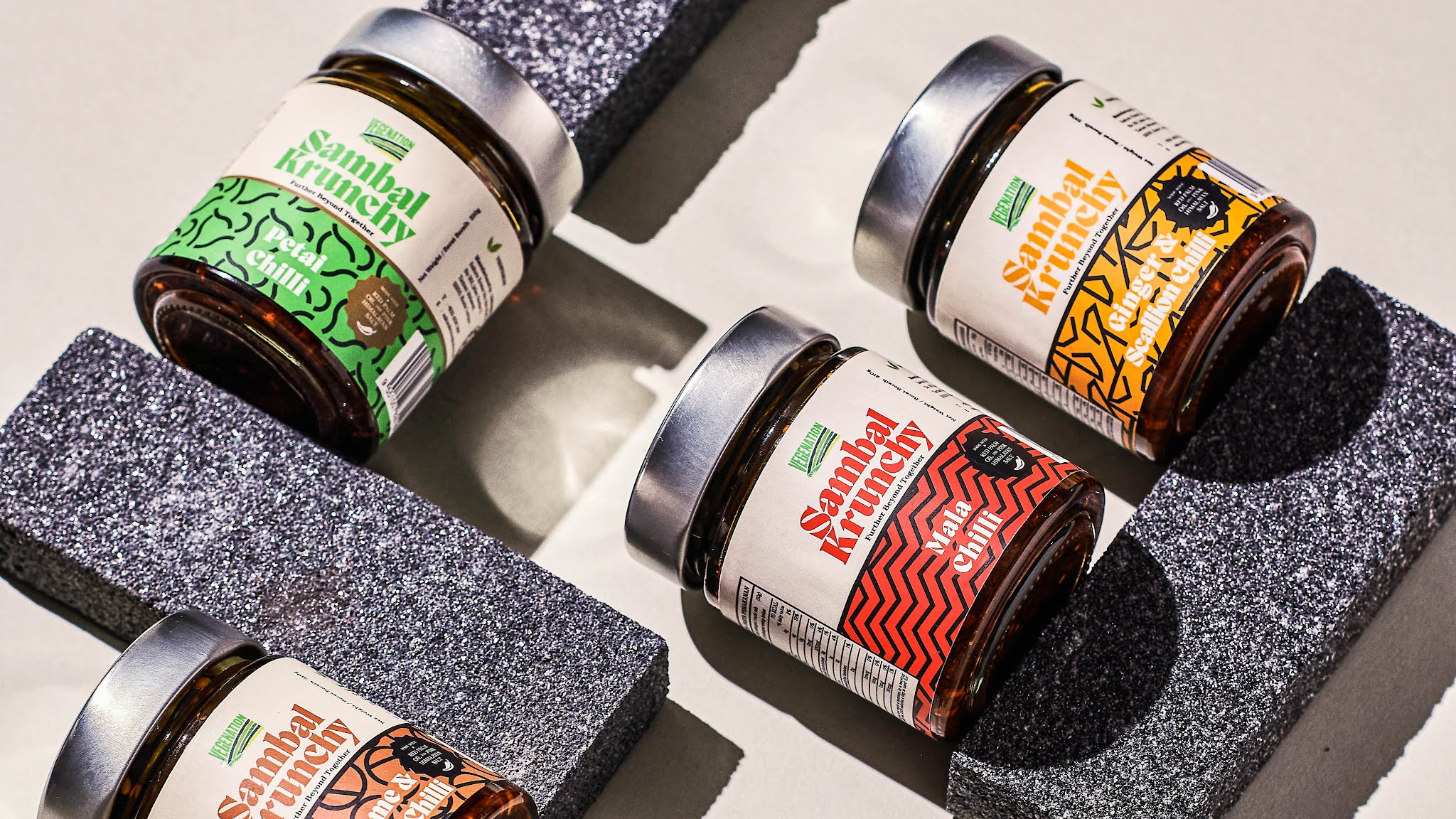 Vegenation 是一家馬來西亞有機素食公司,致力于為世界帶來美味健康的素食產品。受馬來西亞傳統蠟染圖案的啟發,包裝設計公司對其進行了現代化和最小化,并將其轉化為大膽的圖案,以反映每種口味的味道和質地. 鮮艷的色彩背景是根據蔬菜產品的顏色挑選的,充滿活力和色彩。包裝設計公司基于這個想法為他們的第一個產品 Sambal Krunchy 創建了一系列包裝設計